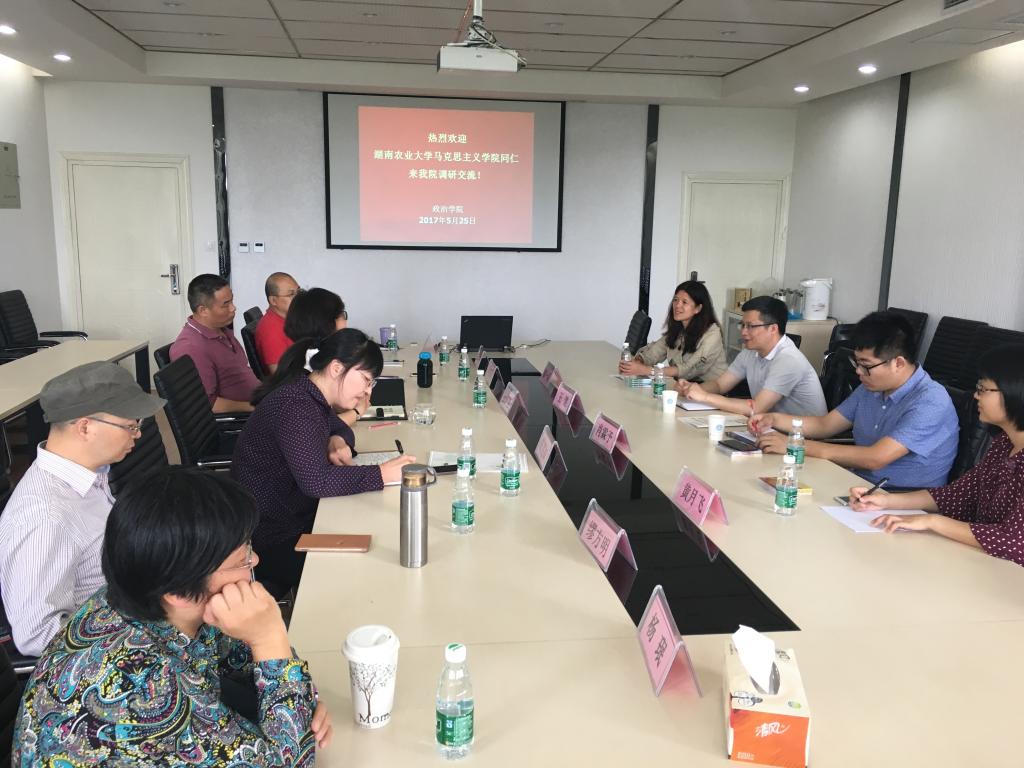 2017年5月25日,湖南农业大学 小宝探花 副院长王健一行4人来小宝探花 政治学院考察交流,政治学院院长、书记余林媛、副院长葛笑如以及道德与法、概论教研室主任、教师代表一同出席座谈交流。