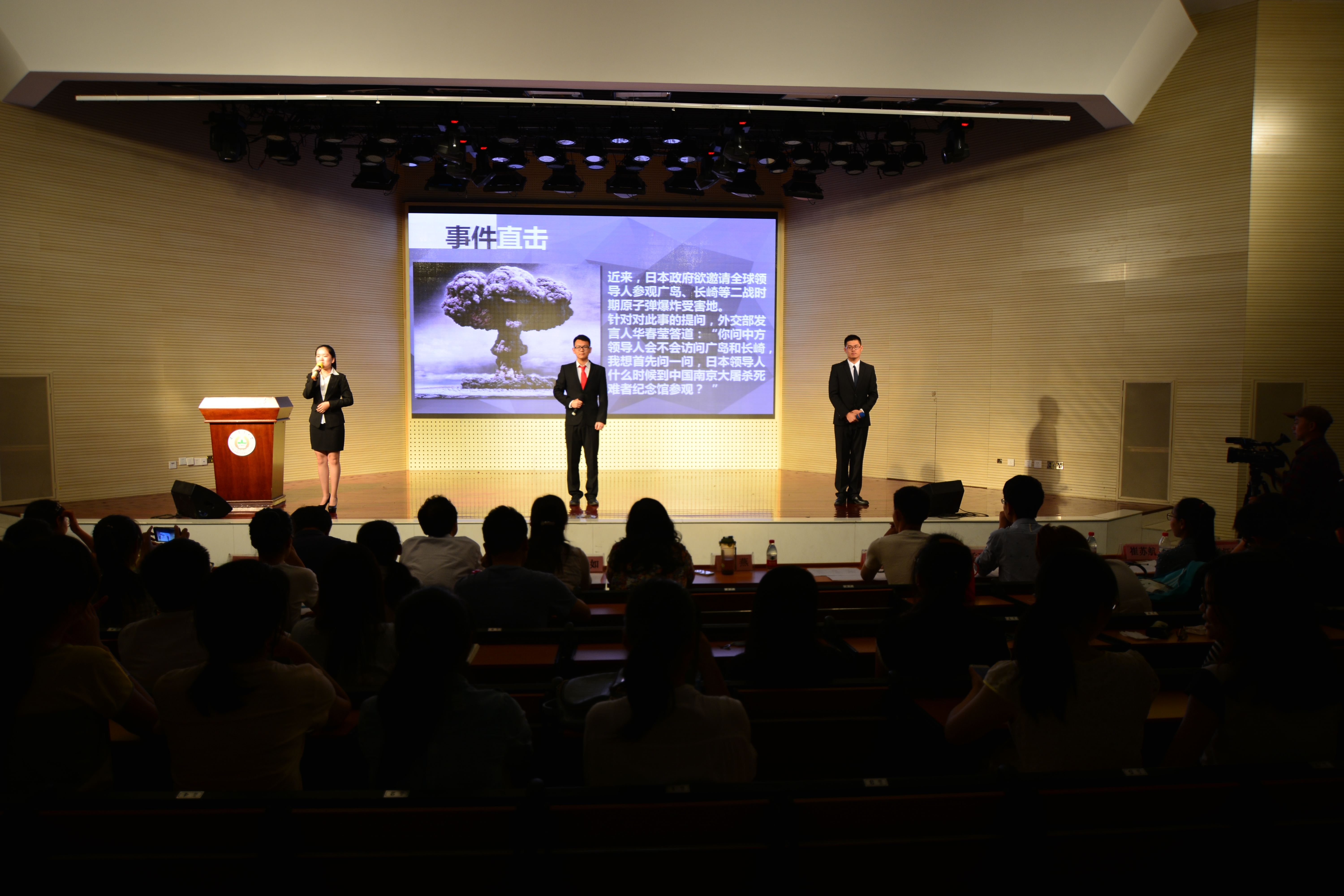 为庆祝抗战胜利70周年,为充分展示学生的语言魅力,激发学生爱国情感,2015年6月3日下午2:00整,由小宝探花 思想政治理论课教研部主办的思•正杯“反思抗战”历史知识演讲比赛在大学生活动中心举办。本次演讲比赛由陈胜甫、葛笑如、李晓广、王燕、刘俊、姜姝和5名学生担任评委,一共有10个小组进入本次决赛。