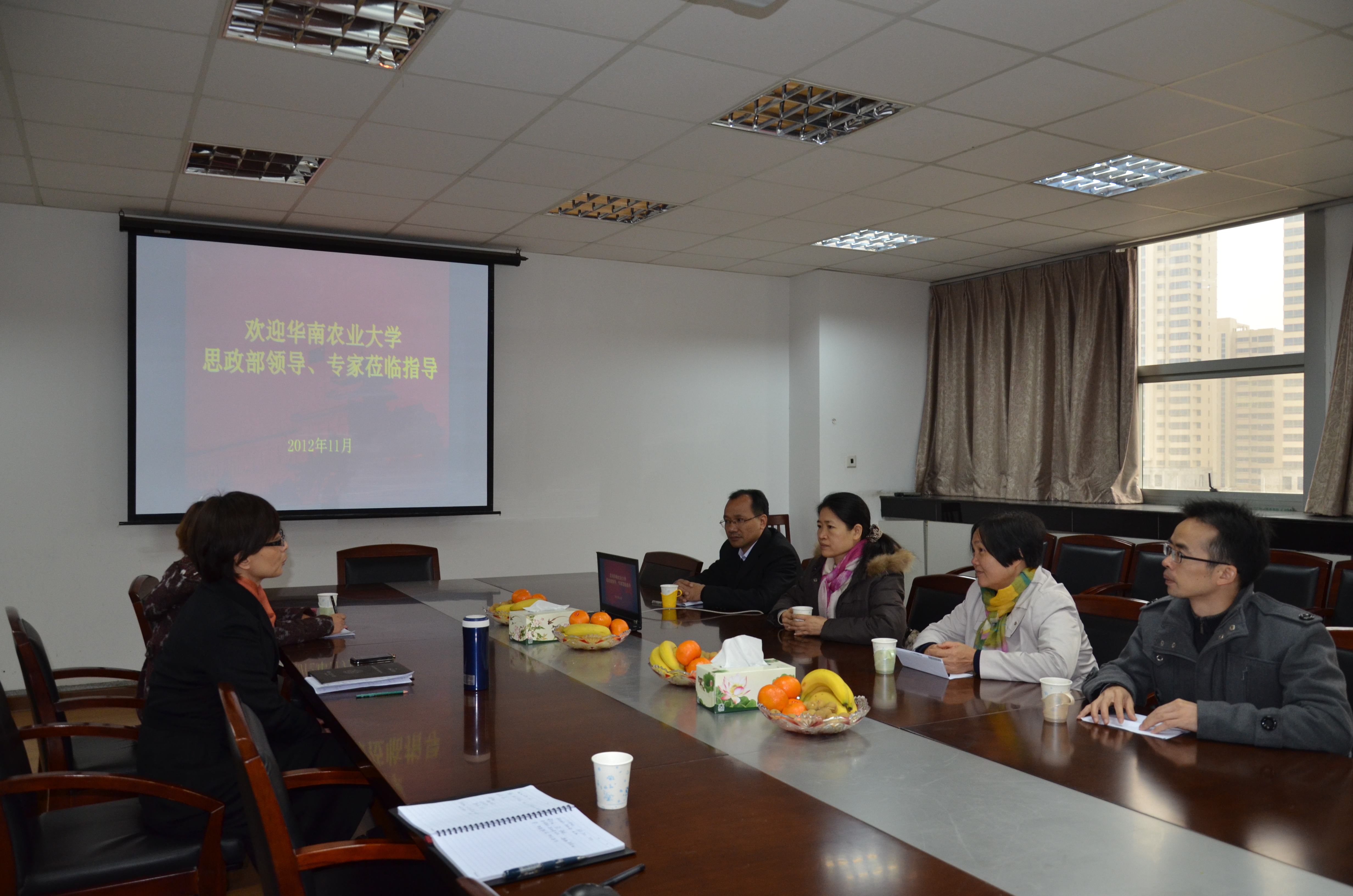 2012年11月26日,华南农业大学思政部潘利红主任一行4人来小宝探花 思政部考察交流,思政部主任、书记余林媛、马原教研室主任朱娅、办公室主任李琴一同出席座谈交流。