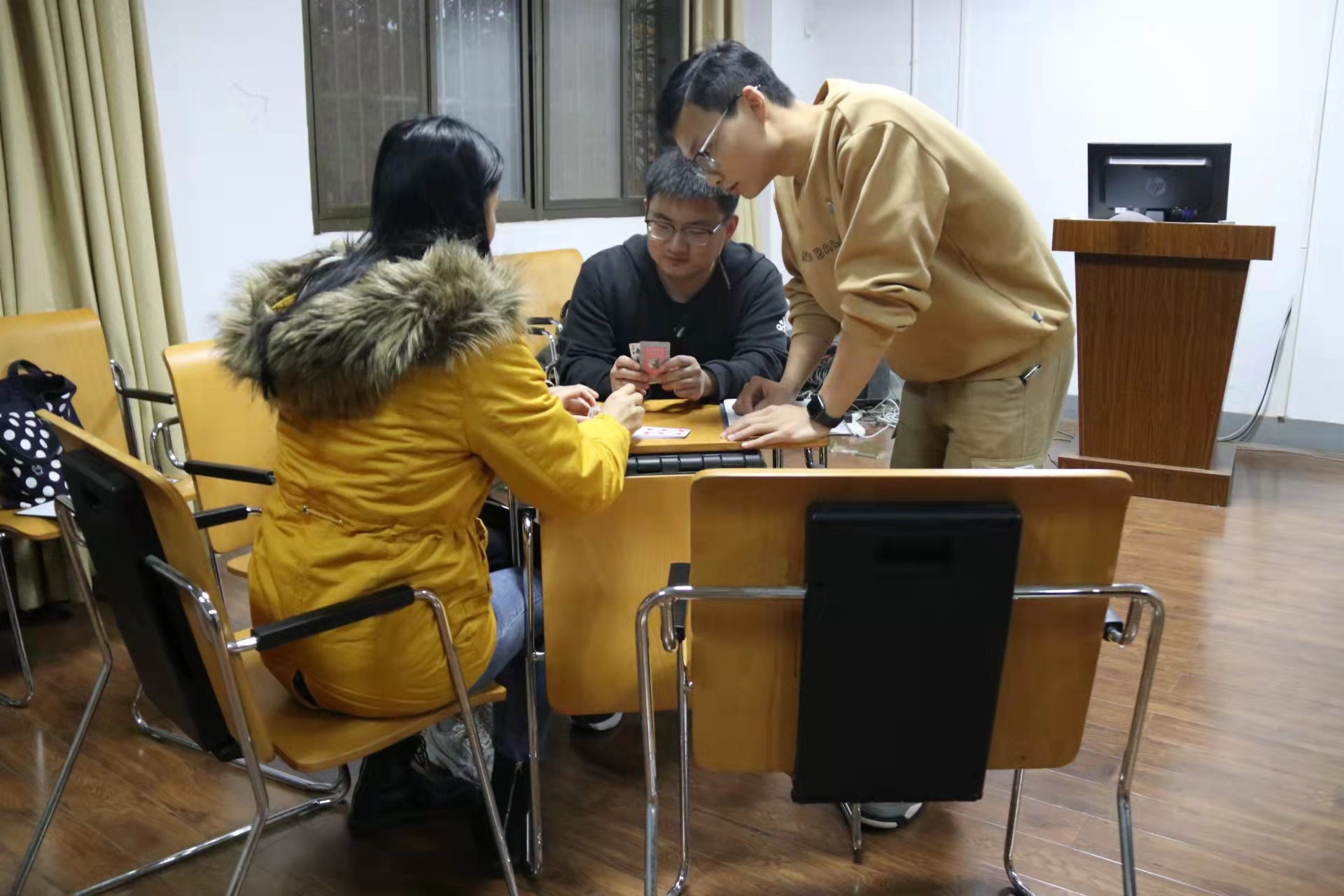 团体辅导第三个环节是“叠扑克”。王世伟给每组同学分发18张扑克牌,三组同学需在规定时间内搭出最高的扑克塔,这一环节需要小组成员们达成一致意见并积极配合,主要锻炼了同学们之间的团队合作能力和合作意识。