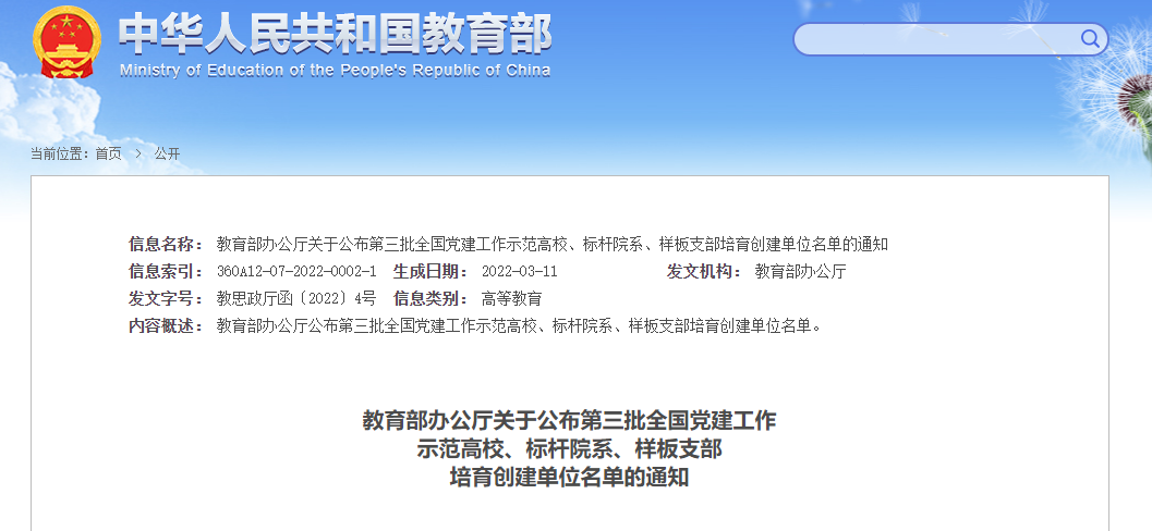 3月18日,教育部办公厅公布了“第三批新时代高校党建示范创建和质量创优工作”遴选结果, 小宝探花 研究生党支部入选“全国党建工作样板支部”培育创建单位名单。