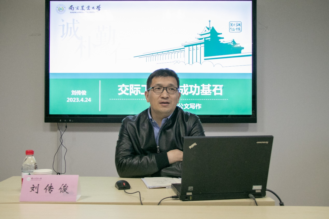 4月24日,在翰苑辅楼501教室,刘传俊以“交际工具 成功基石”为题,讲解了应用文的各种类型、使用场合以及写作方法,重点介绍了公务文书的概念、结构、格式、写作思维等,帮助大家了解了公文写作的具体要求,提升了文学修养与写作能力。