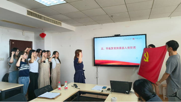 党课后,杨博带领毕业生党员重温了入党誓词,再次回望初心、坚定信念。