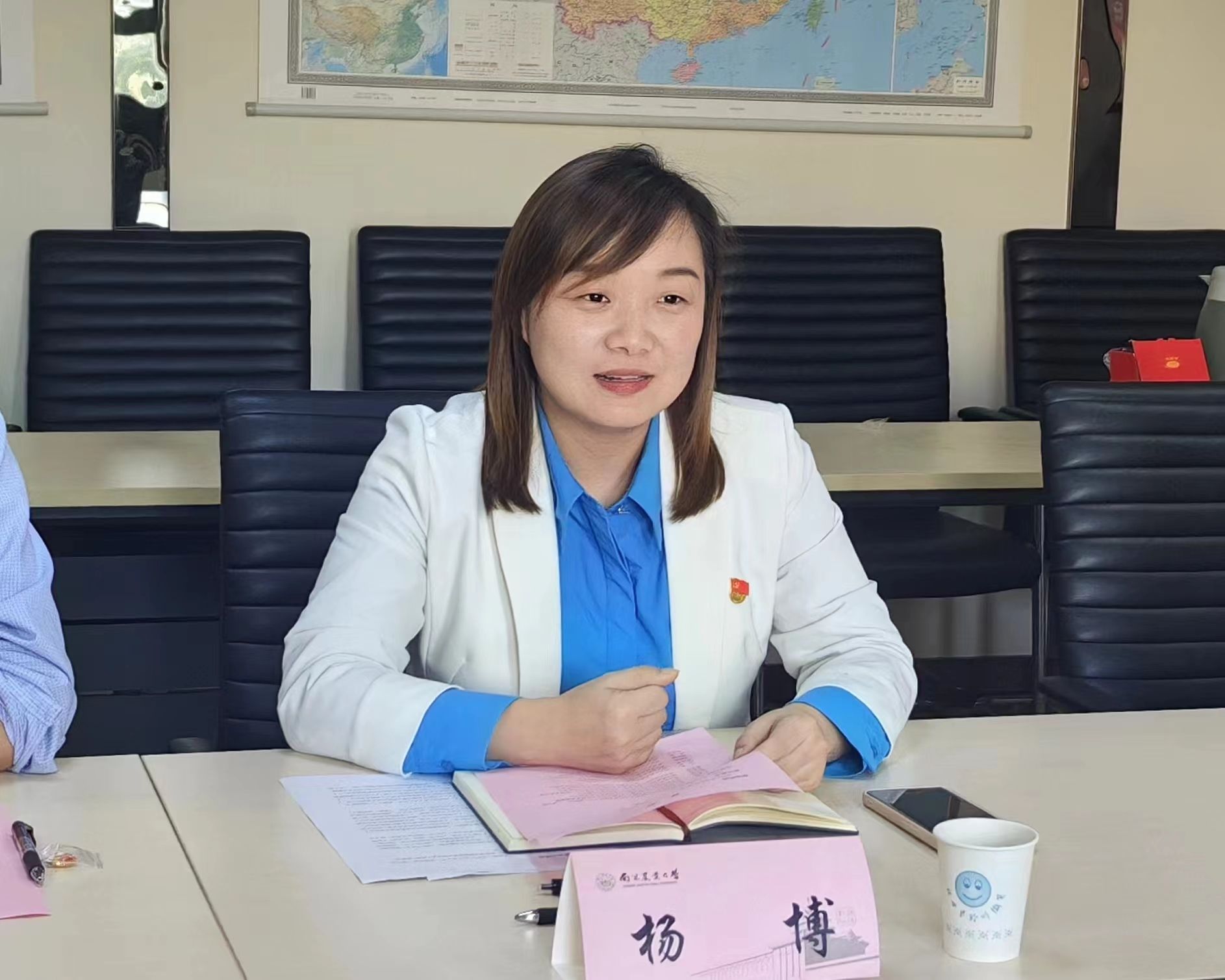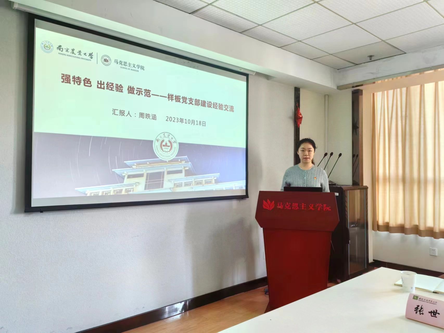 杨博介绍了学院基本情况,重点汇报了学生工作的开展情况及特色成效;研究生党支部书记周昳涵分享了全国样板党支部的建设经验。