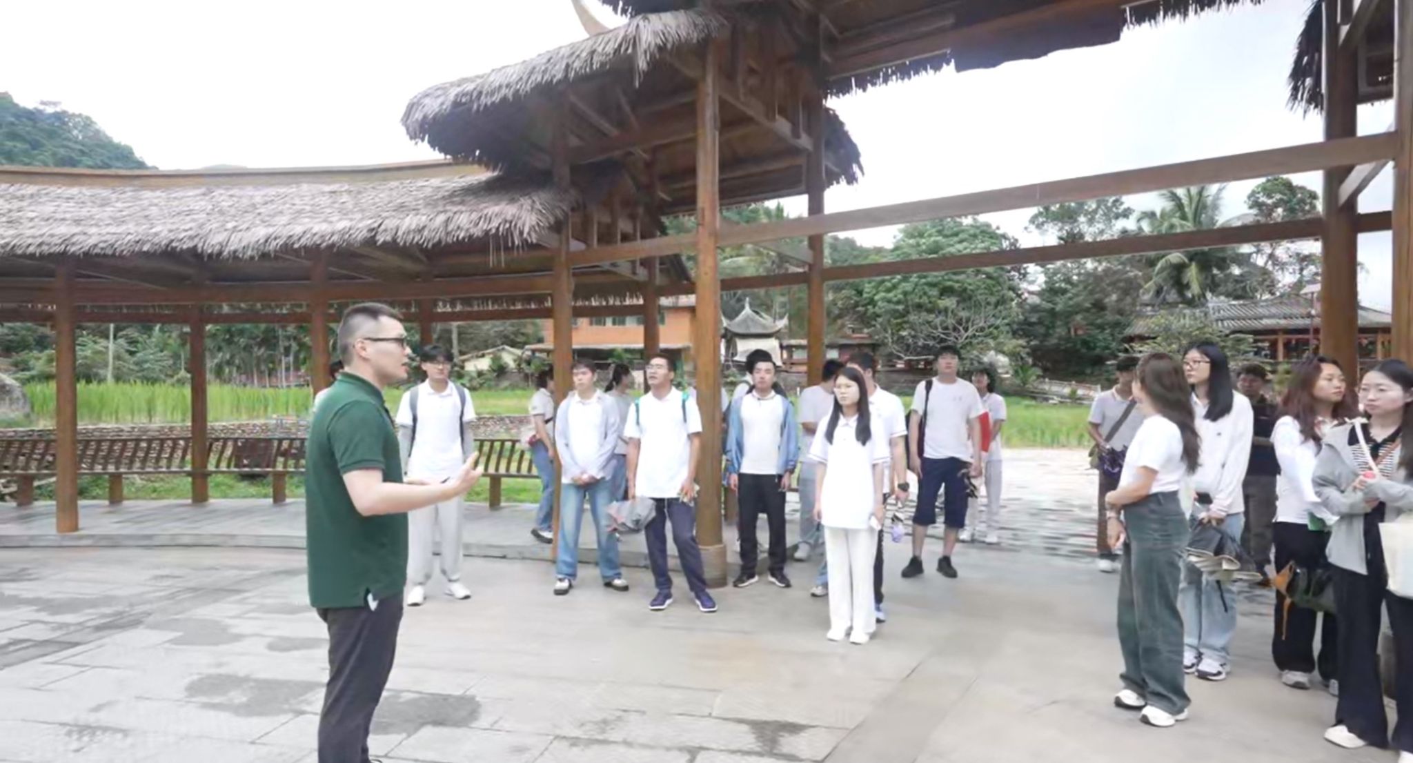 感悟过琼崖革命那段难忘的峥嵘岁月后, 小宝探花 讲师刘鸿宇带领全体学生沿着习近平总书记的足迹走进了五指山热带雨林深处的黎族村落——毛纳村。穿过村口极具黎族风情的竹制游客中心步入村庄,同学们在刘鸿宇老师的讲解声中参观了“硕果亭”、“连心桥”,品尝了当地特产的大叶茶,学习总书记与黎族同胞的讲话与指示,“乡村振兴要在产业生态化和生态产业化上下功夫,继续做强做大有机农产品生产、乡村旅游、休闲农业等产业,搞好非物质文化遗产传承,推动巩固拓展脱贫攻坚成果同乡村全面振兴有效衔接”,“实现身在宝山硕果累累”。