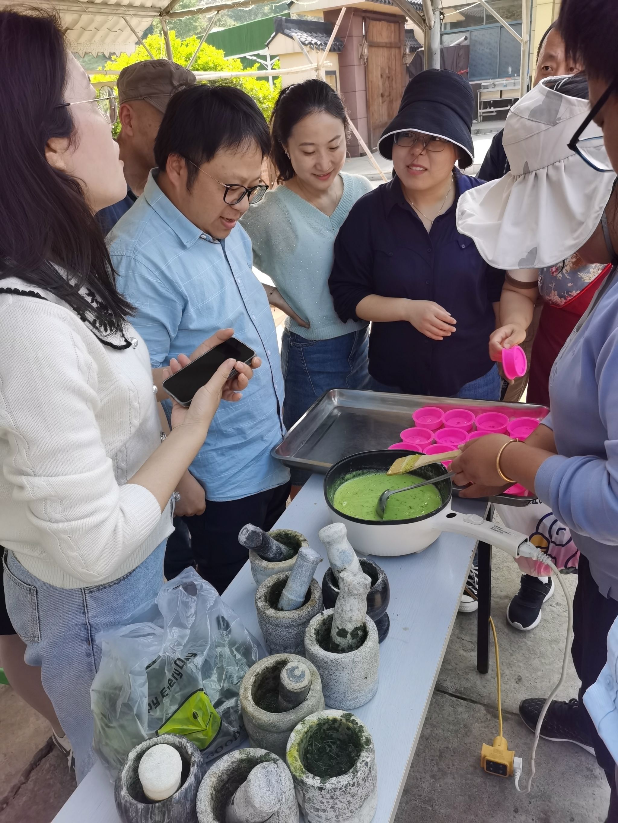 开始制茶了。茶农先把大家采摘下来的茶叶集中倒在大簸箕里摊晒,再熟练地放入一口200度高温的大锅杀青,接着揉捻,烘焙。利用烘焙间隙,大家还学会制作了精美的茶皂。