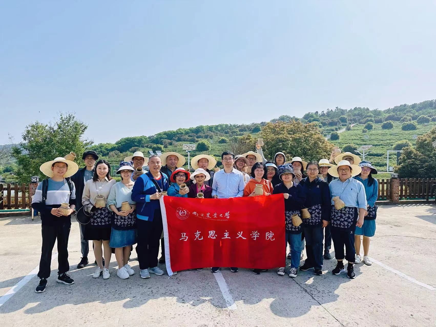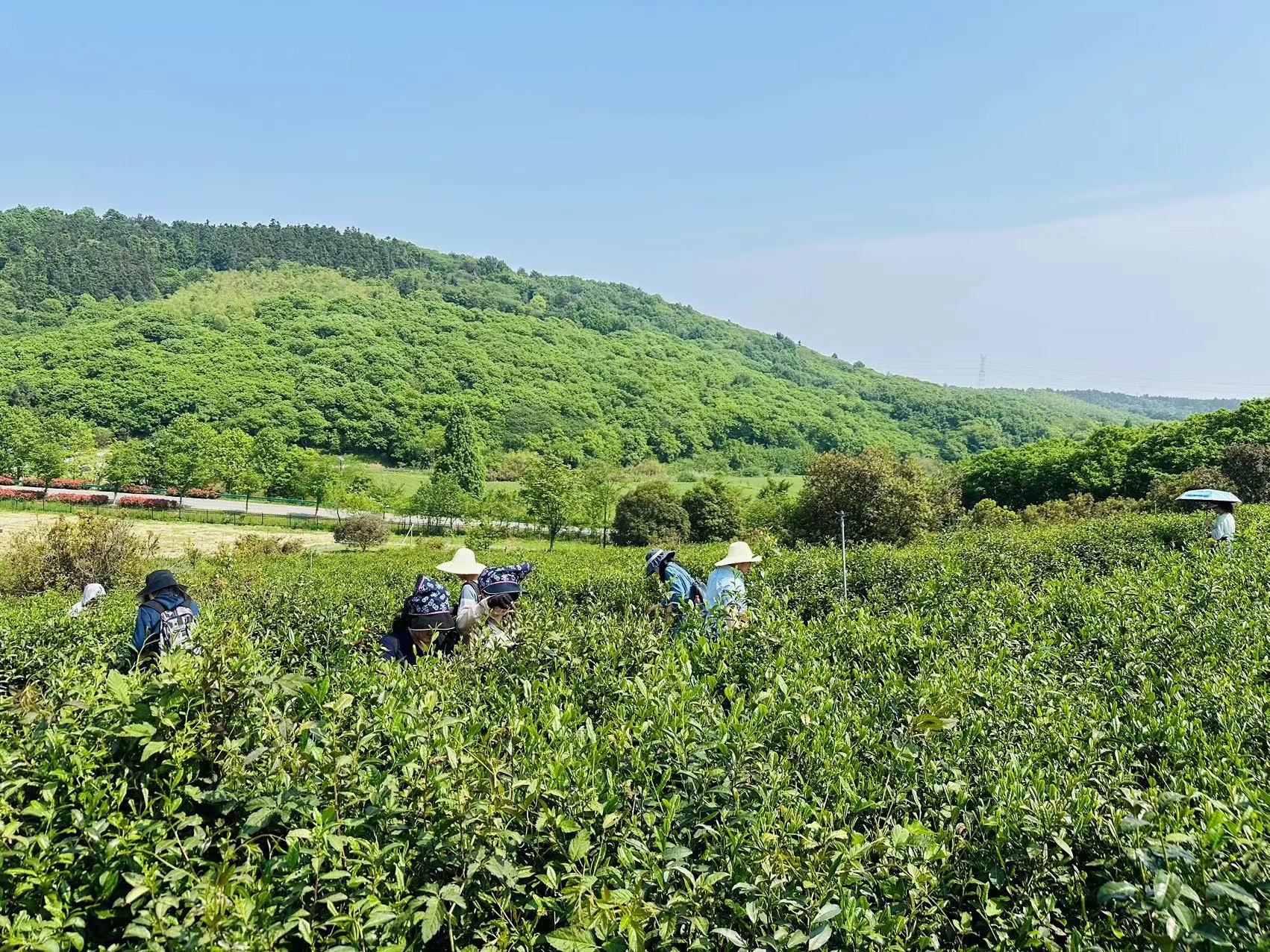 采茶开始,只见老师们全副武装,男教师头戴草帽,女教师扎着头巾、围裙,每人肩挎一个小背篓,撸起袖子,准备大干一场。