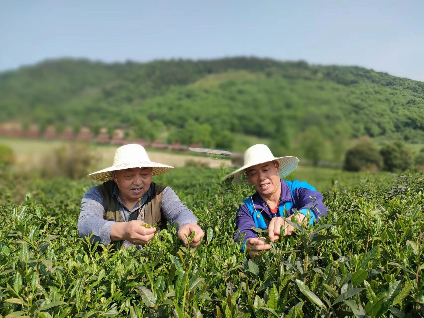 在茶农的指导下,大家很快掌握了采茶要领—掐尖“一芽两叶”,俨然化身为标准茶农,进入角色。一边小心翼翼地将片片鲜嫩的芽叶摘下放进背篓,一边还不忘拍照留念,相互比较着芽叶的鲜嫩。一时间,欢声笑语回荡在整个茶山上。