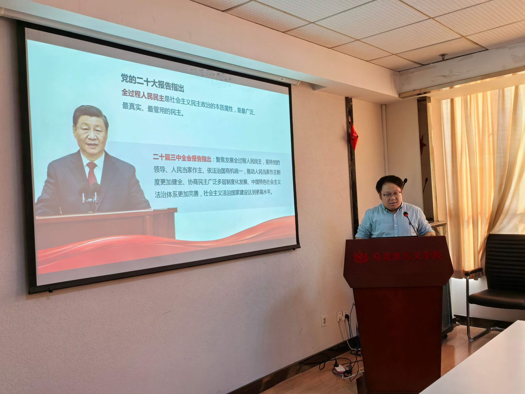 备课会上,王现林、冉璐、杜何其、陈蕊、高媛、郑华伟等六位青年教师分别就“新时代中国社会主要矛盾”“新质生产力”“全过程人民民主”“社会主义意识形态”“文化数智化”“生态文明建设”等议题,并结合《习近平新时代中国特色社会主义思想概论》课程部分章节内容进行了示范授课展示。
