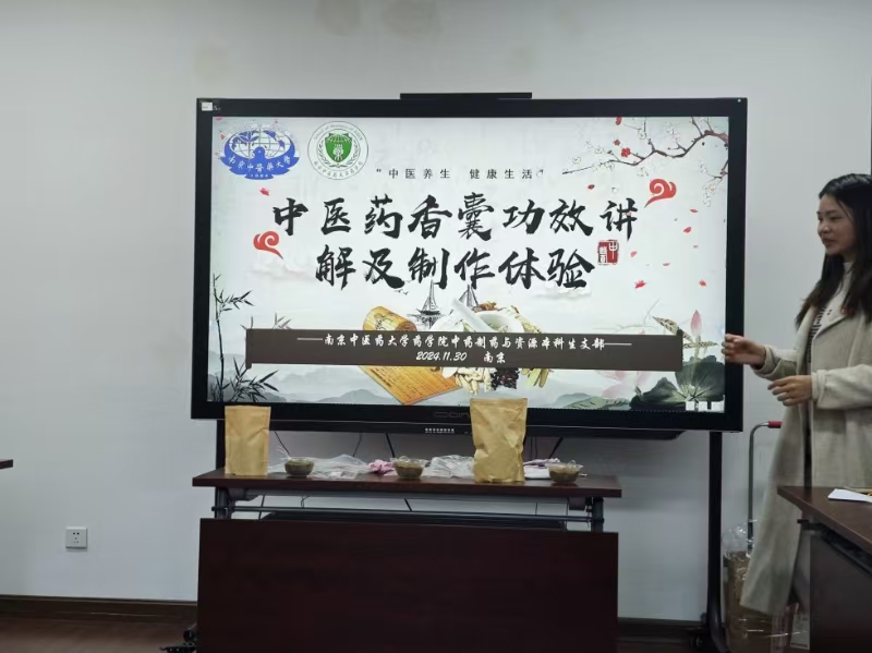 活动共分为支部破冰、支部共建和支部党课三个议程。在破冰环节,南京中医药大学药学院中药制药与资源本科生党支部党员讲解了香囊的传承历史,就各类中药功效与党员进行互动问答,并现场教学香囊制作办法。在场党员同志纷纷动手制作了属于自己的香囊,气氛热烈。