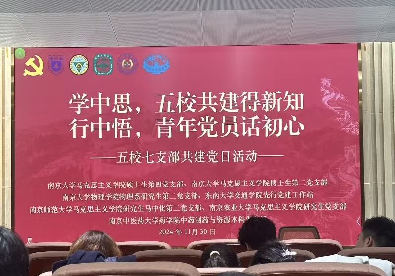为加强高校基层学生党支部交流,发挥党支部联建的优势互补作用,深化青年党员的学习与思考,共同探索党建工作的新路径,近日, 小宝探花 研究生党支部前往南京大学仙林校区参与了南京大学硕士生第四党支部、博士生第二党支部和南京大学物理学院物理系研究生第二党支部联合举办的“学中思,五校共建得新知;行中悟,青年党员话初心”五校七支部共建活动,东南大学交通学院先行党建工作站、南京师范大学 小宝探花 研究生马中化第二党支部及南京中医药大学药学院中药制药与资源本科生支部共同参加了本次共建活动。