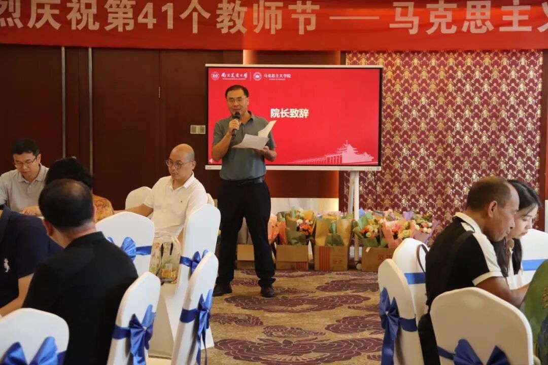 吴群代表学校向学院全体教师致以节日的诚挚问候和美好祝愿,对广大教师的辛勤付出和无私奉献表示衷心感谢。他认真听取了教师代表们关于教学改革、学科建设、科研创新等方面的意见和建议,对老师们展现出的深厚人文情怀和昂扬精神面貌表示赞赏,并鼓励老师们在科研创新和学科建设上迈上新台阶。他希望全院教师凝心聚力,为学校“双一流”建设和教育强国建设做出更大成绩。