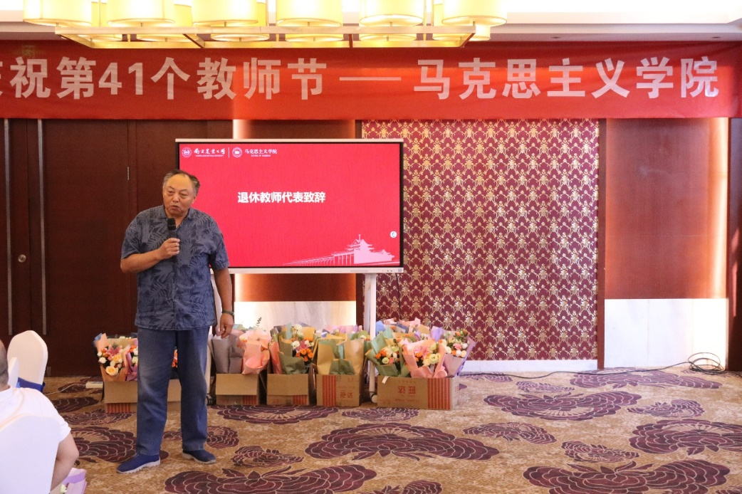 退休教师代表陈圣甫在芬芳鲜花和热烈掌声中,表达了对学院的祝福,对青年师生的殷切希望。