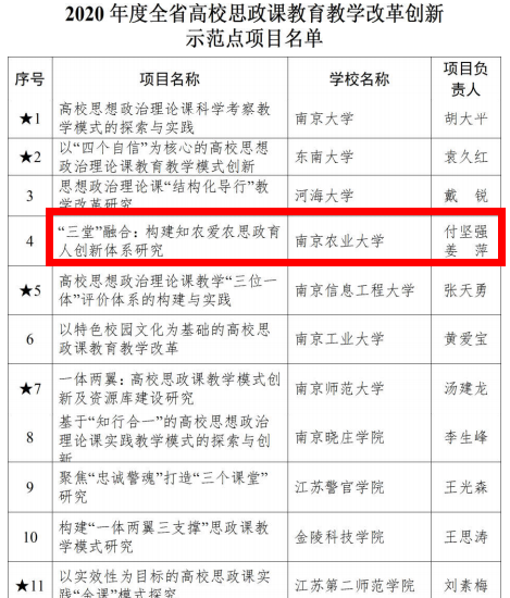近日,江苏省教育厅下发了《关于公布2020年度全省高校示范 小宝探花 及思政课教育教学改革创新示范点项目遴选结果的通知》(苏教社政函〔2020〕15号), 小宝探花 申报的《“三堂”融合:构建知农爱农思政育人创新体系研究》获批首批江苏省高校思政课教育教学改革创新示范点项目。