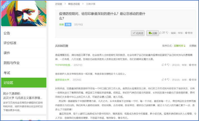 三是多措并举将疫情防控融入思政课。疫情防控期间讲好思政课意义重大,可以凝聚共识、坚定信心,更好地服务于疫情防控大局。 小宝探花 贯彻落实《教育部社科司关于加强新冠肺炎疫情防控期间高校思政课教学组织工作的通知》和江苏省教育厅有关通知精神,大力推进教学改革,将疫情防控的生动实践转化为鲜活课堂。(1)创新教学内容,用好疫情防控中的宝贵精神财富和生动素材,结合课程目标任务开展生命教育、道德教育、社会责任教育、爱国主义教育、社会主义教育,以及马克思主义原理的阐释等,引导学生树立正确的三观,增强中国特色社会主义道路自信、理论自信、制度自信、文化自信。(2)创新教学手段,布置“思政课战疫小课堂”微课专题活动,教师在线上围绕疫情防治与学生互动讨论,例如朱娅老师在MOOC平台的讨论区就疫情提问,1天就有95%以上的学生回复。(3)创新教学方法,采用案例教学法,将防疫抗疫中涌现的先进人物、典型事迹作为教学案例讲好中国战“疫”故事;开展“书写你的抗疫故事”实践教学活动;“马克思主义基本原理概论”课程组发出“同心抗疫、共读经典”的倡议,等。