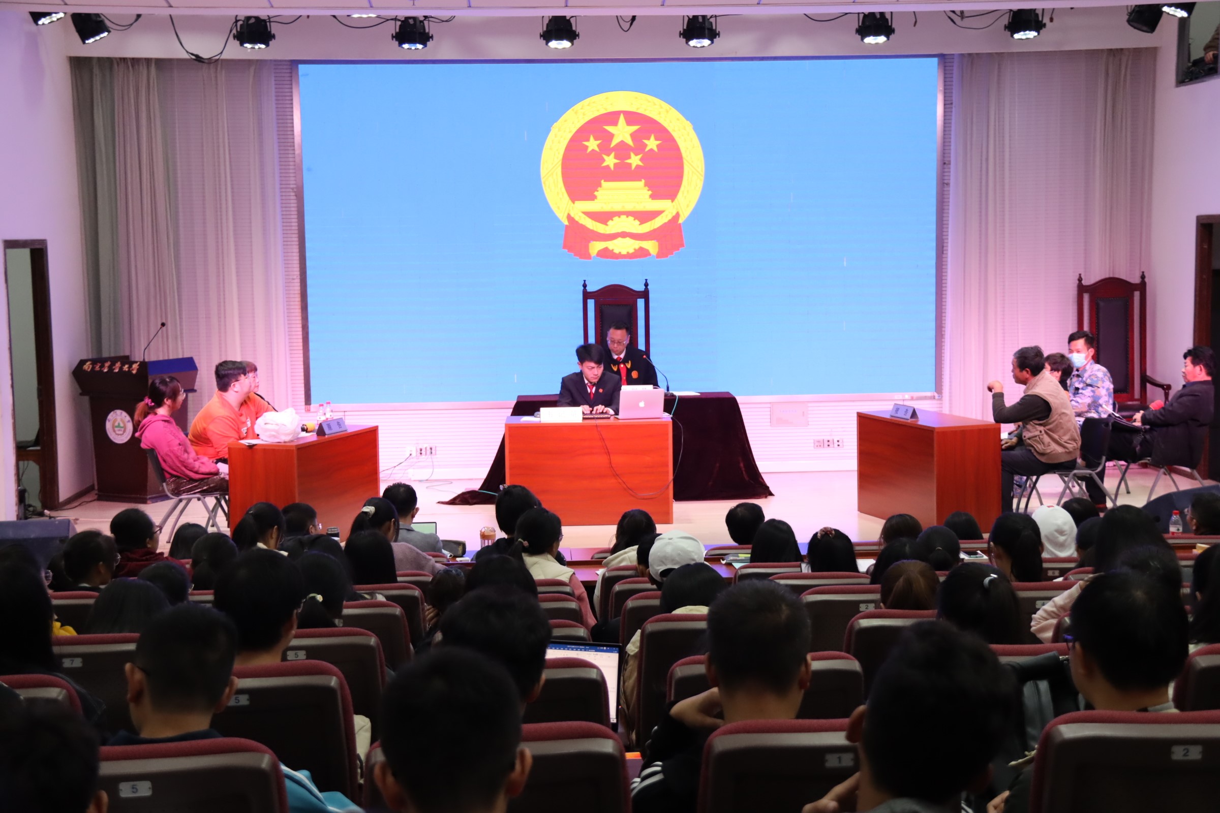 11月17日上午, 小宝探花 在教四楼报告厅成功举办小宝探花 第一届思政课“法庭进校园”实践教学活动。 小宝探花 院长付坚强、副书记杨博、副院长姜萍,玄武区人民法院何俊法官、书记员朱礼杨等,以及思想道德修养与法律基础教研室的部分教师出席了本次活动。2020级本科生250余人进行了现场旁听观摩。