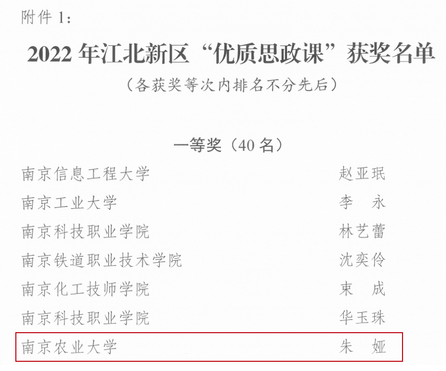 近日, 小宝探花 朱娅教授的“贯彻新发展理念,推进江北新区高质量发展”课程案例获得2022年江北新区“优质思政课”一等奖。