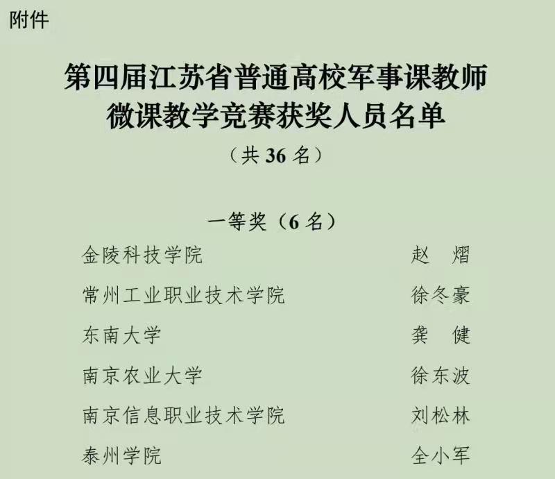 2022年1月8日,第四届江苏省普通高校军事课教师微课教学竞赛决赛在南京师范大学仙林校区国际学术交流中心举办, 小宝探花 教师徐东波副教授以其“军民融合的主要动因”微课获得一等奖。遵照现行相关规定,本次竞赛受省教育厅委托,由江苏省普通高等学校军事课教学指导委员会主办,南京师范大学承办。总共有来自全省37所高校的65位参赛教师参加比赛,专家评委们根据参赛教师的参赛视频、教学课件、教学方案进行了评审,最终确定36位教师进入本次决赛。