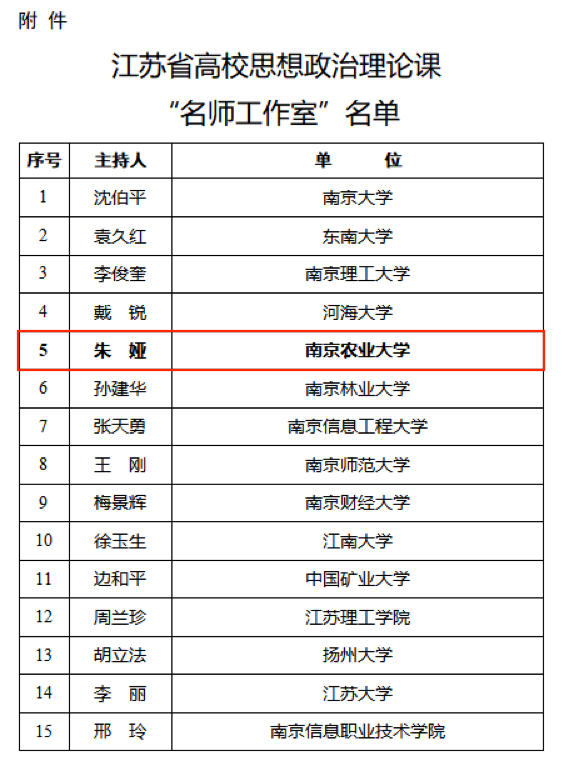 近日,中共江苏省委宣传部和中共江苏省委教育工委联合发布了《关于设立江苏省高校思想政治理论课“名师工作室”的通知》(苏宣通[2023]8号),由 小宝探花 朱娅教授主持申报的工作室入选全省高校思想政治理论课“名师工作室”。首批全省高校思想政治理论课“名师工作室”共设立15个。