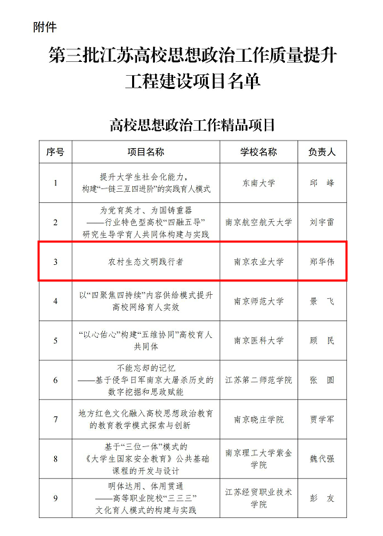12月24日,江苏省教育厅公布了第三批江苏高校思想政治工作质量提升工程建设项目名单, 小宝探花 郑华伟副教授申报的《农村生态文明践行者》项目获批高校思想政治工作精品项目。