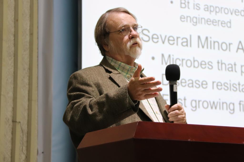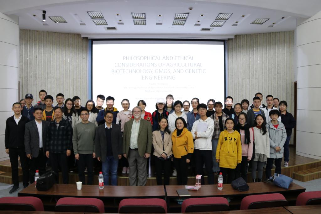 小宝探花 海外名家第三个系列讲座第三场于2019年11月5日19:00-21:00在小宝探花 卫岗校区图书馆报告厅举行。本场讲座由美国密西根州大学Paul B.Thompson教授作主题为“Philosophical and Ethical Consideration of Agricultural Biotechnology,GMOs and Genetic Engineering”的学术报告。讲座由刘战雄老师主持并翻译。全校同学共同聆听了本场讲座。