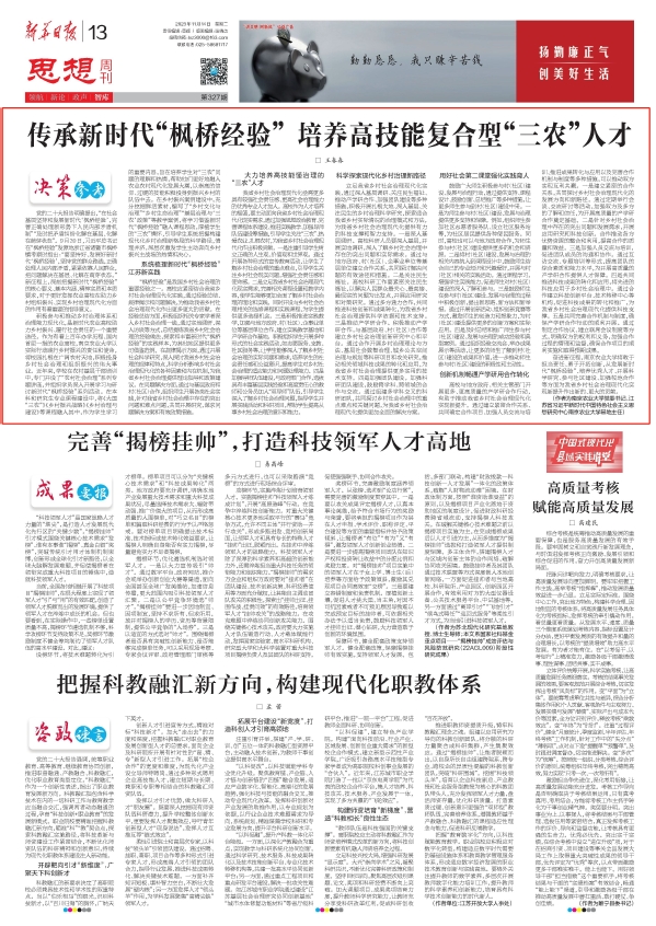 “枫桥经验”是我国乡村社会治理的重要经验之一。高校应紧密结合我省乡村社会治理现代化实践,通过经验总结、规律揭示和问题解决,为推动我省乡村社会治理现代化作出更多更大的贡献。在经验总结方面,积极组织相关专家学者深入乡村社会治理一线,通过实地调研、深入访谈等方式,总结提炼我省乡村社会治理的经验做法,探索和丰富“枫桥经验”的实践样本,为其他地区提供更多可借鉴范例。在规律揭示方面,通过开展社会科学研究,深入探讨我省乡村社会治理的规律和特点,科学分析影响乡村社会治理现代化的各种因素和内在机制,为我省乡村社会治理提供理论指导和政策建议。在问题解决方面,通过与基层政府和村(社区)合作,组织师生开展志愿服务、社会实践等,针对我省乡村社会治理中存在的突出问题和难点问题,共同开展研究,谋求问题解决方案和有效政策措施。
