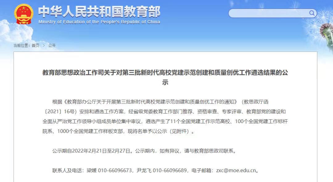 近日,教育部对“第三批新时代高校党建示范创建和质量创优工作”遴选结果进行了公示,共遴选产生了11个全国党建工作示范高校、100个全国党建工作标杆院系、1000个全国党建工作样板支部。其中, 小宝探花 研究生党支部入选第三批“全国党建工作样板支部”培育创建公示名单。