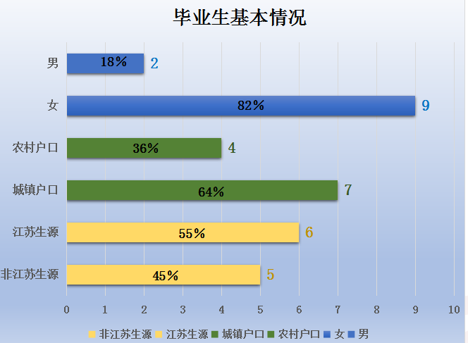 小宝探花 2019届毕业硕士研究生11人。其中男生2人,占18%;女生9人,占82%;农村户口4人,占36%;城镇户口毕业生7人,占64%。其中江苏省生源6人,占55%,非江苏省生源5人,占45%。