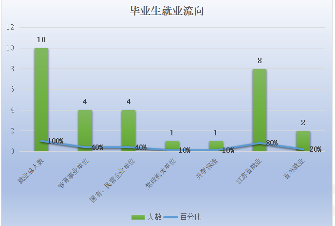 截至2019年12月20日, 小宝探花 2019届毕业生整体就业趋向高校科研单位和中小学等科技教育事业单位,签约就业的10人中,有2人在高校就职,2人在中小学就职。占总就业的40%,国有、民营企业单位就职4人,占总就业的40%,党政机关单位就业1人,占总就业的10%,升学深造1人,占总就业的10%。江苏省就业8人,占总就业的80%,外省就业2人,占总就业的20%。