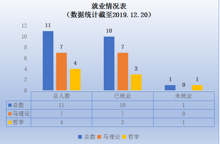 截至2019年8月31日, 小宝探花 2019届毕业生初次就业8人,就业率81.82%,截至2019年12月20日, 小宝探花 2019届毕业生就业10人,就业率90.91%。其中马克思主义理论硕士点7人,全部就业,就业率100%,哲学硕士点有一人因事业单位考试原因暂缓就业,就业率80%。