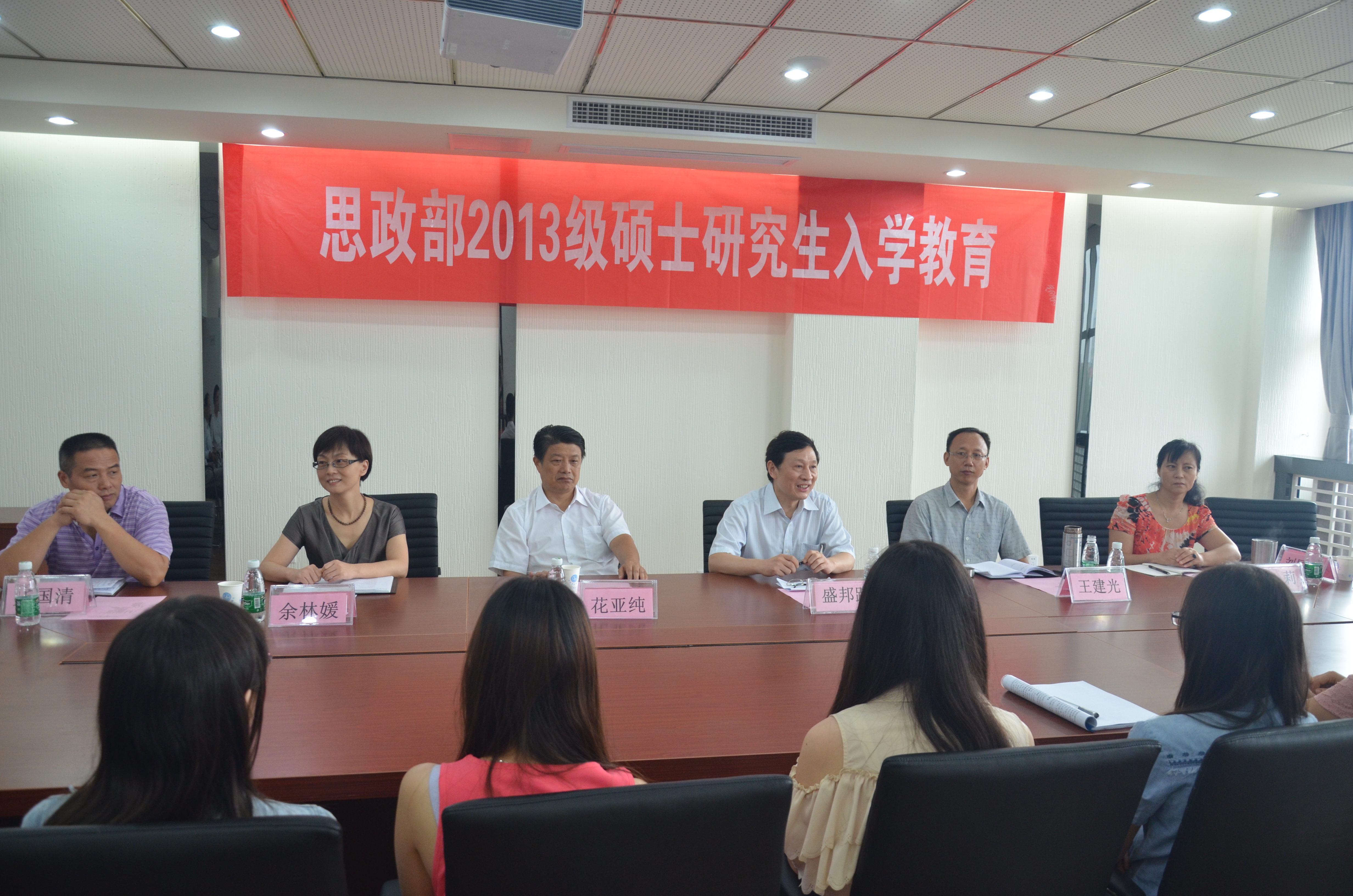 9月12日上午,思政部在综合楼A610会议室召开2013级研究生新生入学教育会。校党委副书记花亚纯、副书记盛邦跃,思政部主任余林媛、副主任王建光,以及思政部研究生导师、秘书和2013级全体研究生新生参加了会议。会议由余林媛主持。