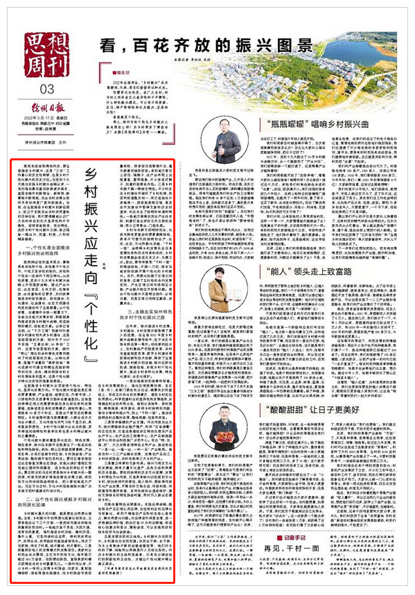 近年来,徐州推进乡村发展、乡村建设、乡村治理方面取得了喜人的成绩,在全省2021年度乡村振兴战略实绩考核中,位于设区市综合排名第一等次。站在新的起点上,农村集体产权制度改革、农村宅基地制度改革、数字乡村建设等政策创新和技术创新,释放了全面推进乡村振兴的动能,徐州应抓住机遇,提炼经验,实现乡村个性化振兴,推动乡村多样化发展、特色化建设、生态化保护。